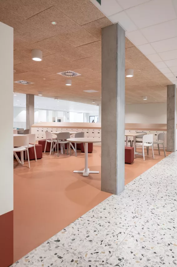 De open leerplekken op de lagere verdiepingen zijn formeel gedeeld, maar in de praktijk eigen aan één doelgroep. Hun locatie en nabijheid tot de respectievelijke speelplaatsen zorgen voor een natuurlijke toewijzing – zonder dat dit rigide wordt.