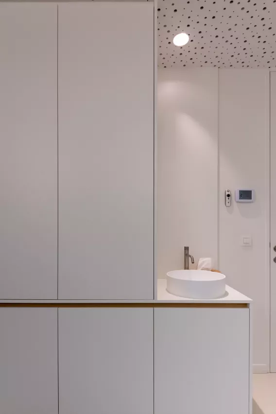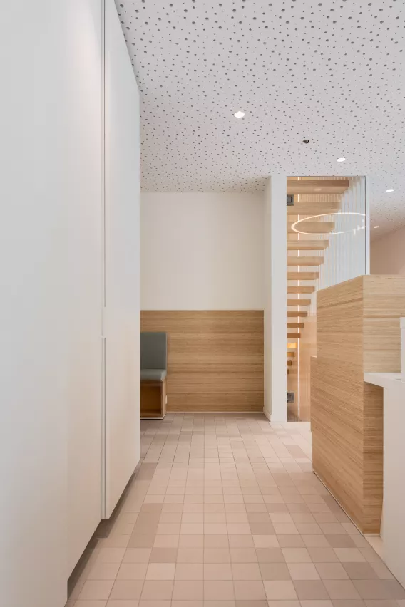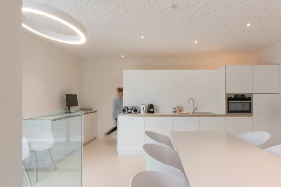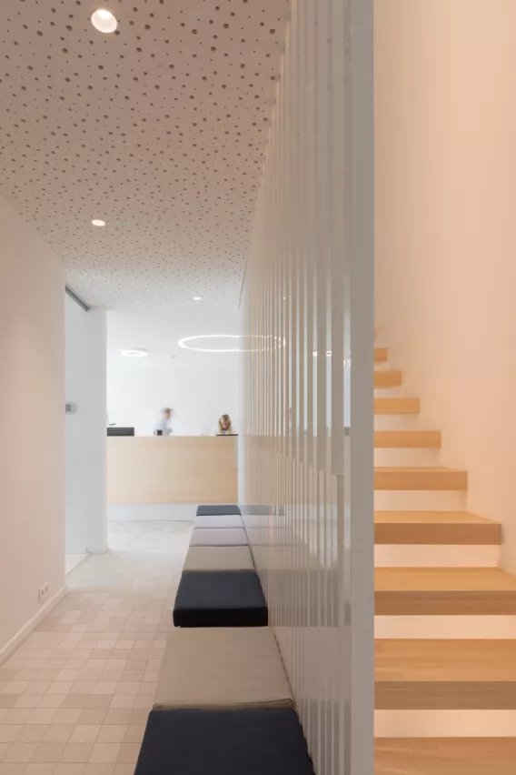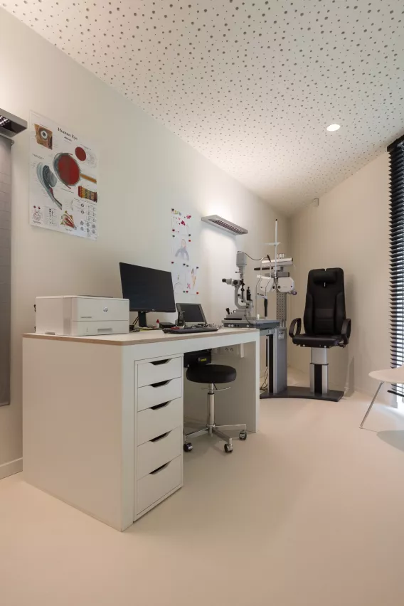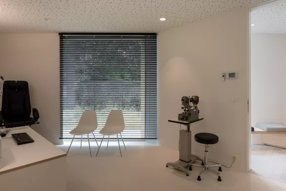 De indeling van de praktijkruimte op het gelijkvloers is heel functioneel opgevat. Een oogartsen praktijk werkt niet zoals een typische dokterspraktijk, er zijn heel wat vooronderzoeken die moeten gebeuren vooraleer de patient bij de arts in zijn praktijk komt. Daarvoor is er gekozen om een open ruimte te maken, een straat, waarbij de praktijk kleine intiemere entiteiten zijn. De wachtruimtes zijn dan ook verdeeld over de volledige oppervlakte, zodat de patiënt al kan plaatsnemen voor de praktijkruimte waar hij straks moet binnengaan. Op de verdieping hebben de artsen een private ruimte, die zicht heeft op de straat en op de inkompartij van de praktijk. Zo is er altijd een goede controle.