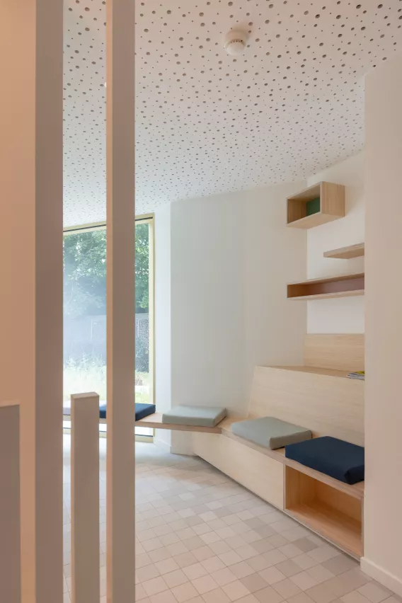 Het bouwperceel is een parallellogram, en loopt achteraan uit op een punt. De combinatie van het bouwprogramma en de te respecteren afstanden tot de grenzen, heeft ervoor gezorgd dat de spitse vorm ook terugkomt in het gebouw. Omwille van de impact op de omgeving, en de functionele indeling, is gekozen om iedere bouwlaag achteraan te laten inspringen.