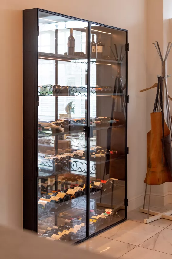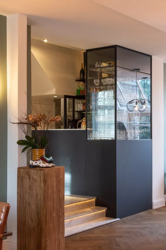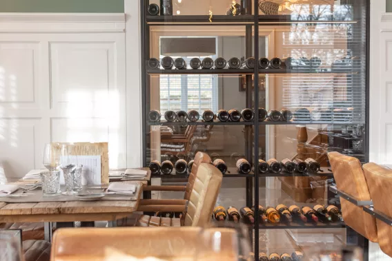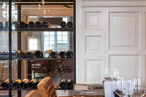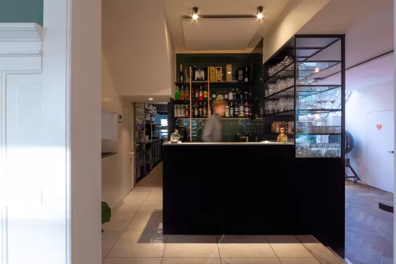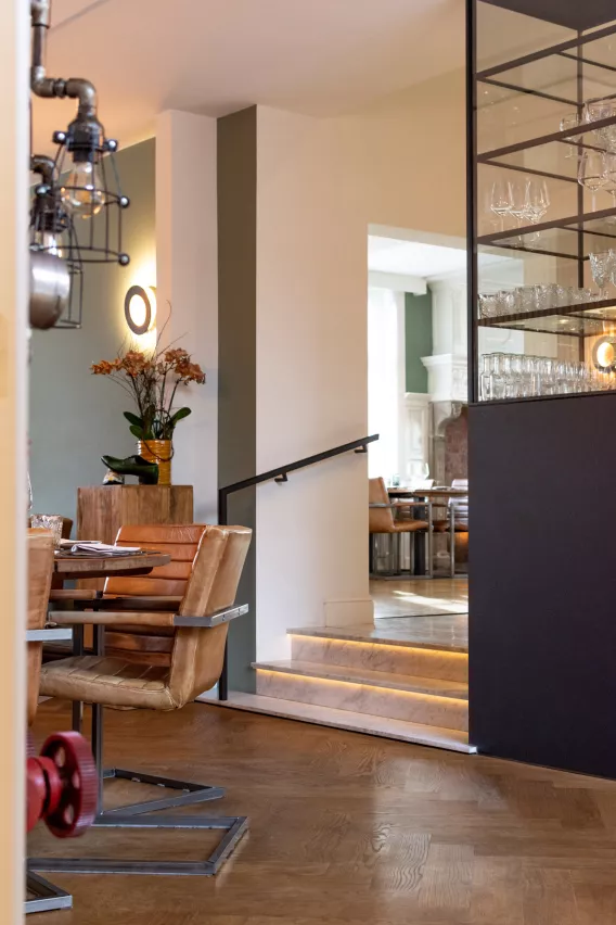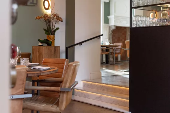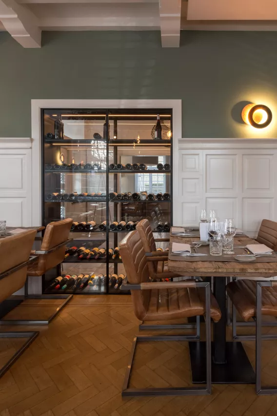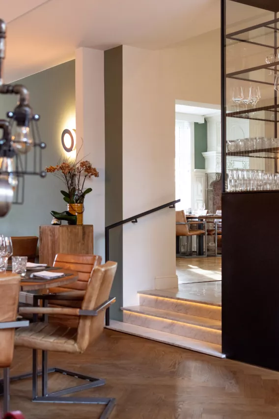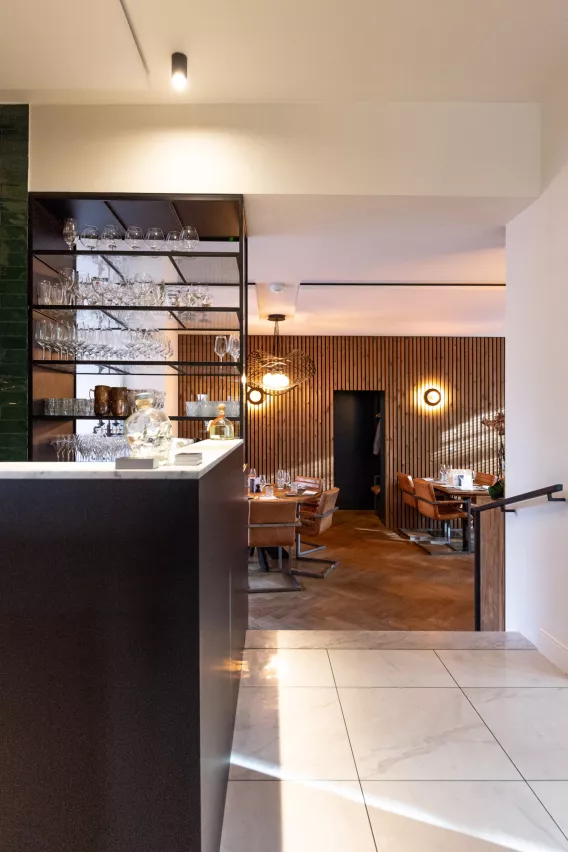 Aanvullend op de uitbreiding werd een totaalontwerp gemaakt voor het interieur van het bestaande en het nieuwe deel van het restaurant. Er werd gekozen met warme, natuurlijke materialen om de eigen stijl van de eigenaars te integreren. Verschillende persoonlijke elementen werden meegenomen om de eigenheid van het restaurant te behouden. Beide gebouwen hebben een woning typologie aan de rand van een mooi stadsplein. Er is in de sfeer heel veel aandacht gegeven aan de persoonlijke beleving. De materiaalkeuzes zijn heel doordacht gebeurd in het kader van de beleving van de woonsfeer maar met veel aandacht voor het akoestisch comfort.