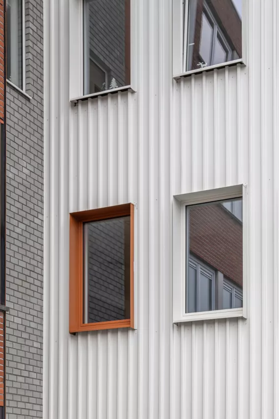 Het zwevend deel boven de brandweg dat wordt ingeplugd in de uitbreiding wordt extra benadrukt door een andere gevelmaterialiteit in geprofileerde staalplaat, dan de betonsteen gevelafwerking van de getrapte basisvorm van de uitbreiding. Grote ramen snijden zich zorgvuldig uit het strakke volume en zorgen voor maximale lichtinval in de klasruimtes. Aangezien het bestaande gebouw al een opvallende rood-roest kleur heeft, werd de uitbreiding ingetogen opgesteld om contrast en rust te brengen. Toch werd er op subtiele wijze gespeeld met enkele roestkleurige accenten in het buitenschrijnwerk en in het poortgeheel. De slim gekozen kleuraccenten werden binnen herhaald en ontplooid om de juiste basis te voorzien waarop iedere leerkracht zijn eigen toets kan aanbrengen.
